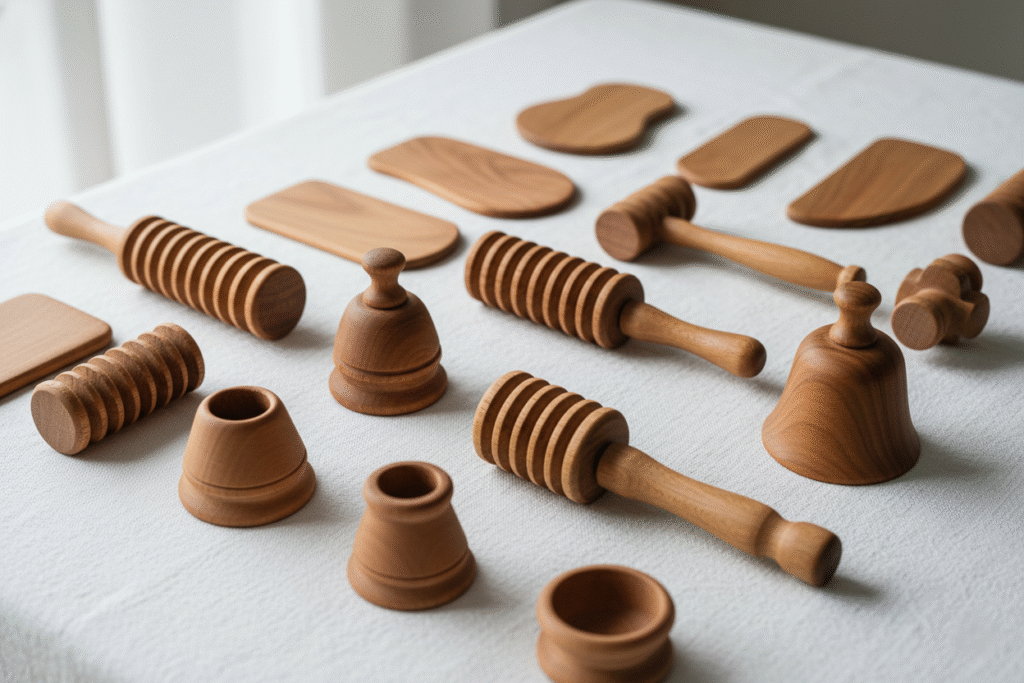 Umfassende Erklärung und praktische Einführung in die verschiedenen Maderotherapie Werkzeuge und deren effektive Anwendung am Körper.